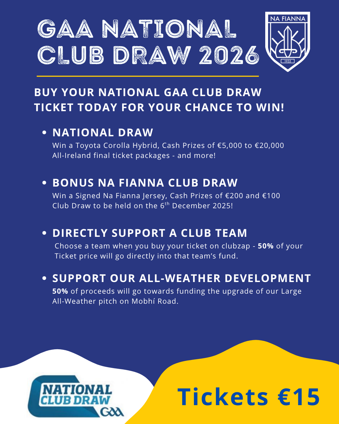 An opportunity to support Na Fianna with the ticket cost going directly towards funding the club All-Weather Redevelopment and supporting your nominated team!